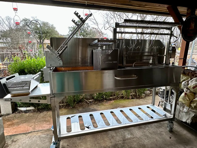 Esta función le permite ajustar la altura de las rejillas para controlar con precisión la temperatura de cocción. Simplemente gire la rueda para subir o bajar las rejillas principales según sus necesidades: más cerca de las brasas para obtener más calor para sellar, o más lejos para obtener menos calor, perfecto para una cocción lenta. Es una característica que se encuentra comúnmente en las barbacoas sudamericanas, diseñada para brindarle un control total sobre su experiencia de asado.
